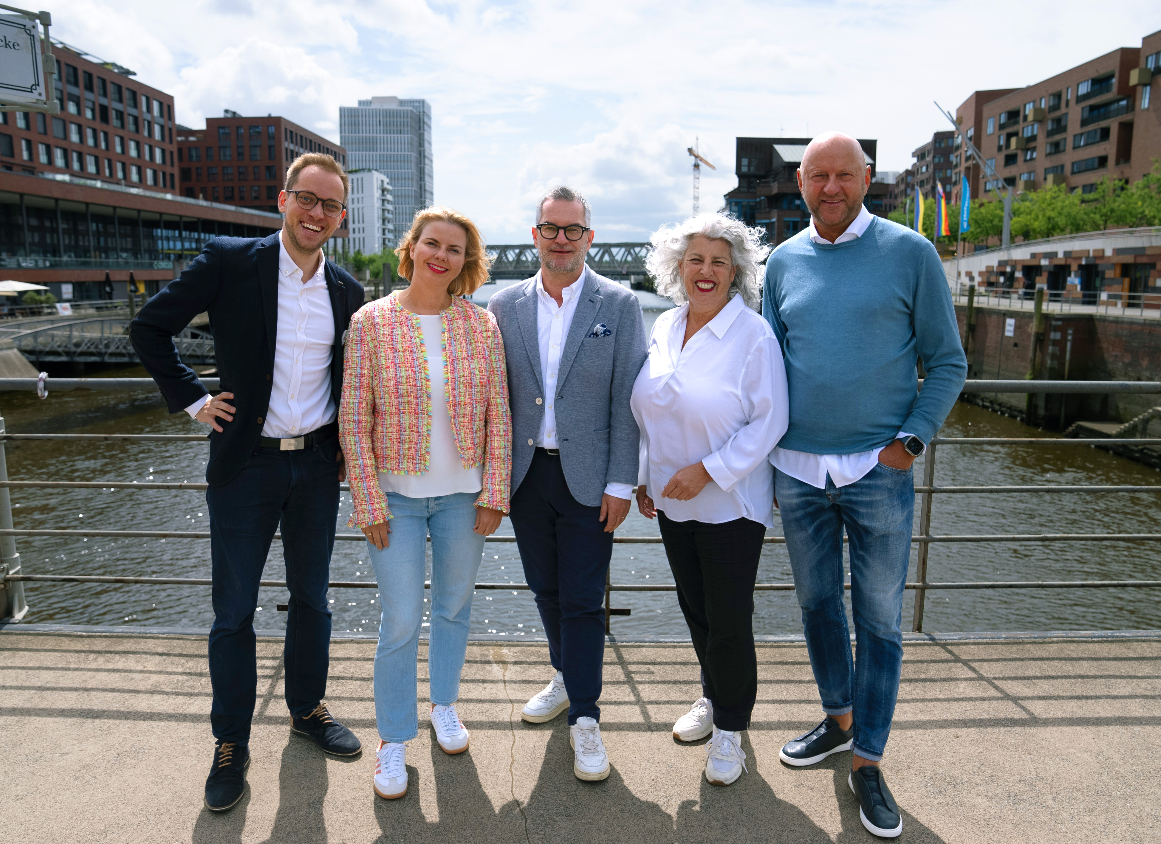 Sprecher:innenteam (von links): Thomas Lerche – Superstage, Karen Mester-Lichtsinn – Unibail-Rodamco-Westfield, Andreas Hiller – HASPA HafenCity, Minou Beatrice Tikrani – Konstruktiv PR GmbH, Bernd Mathiessen – Mathiessen Versicherungsmakler GmbH