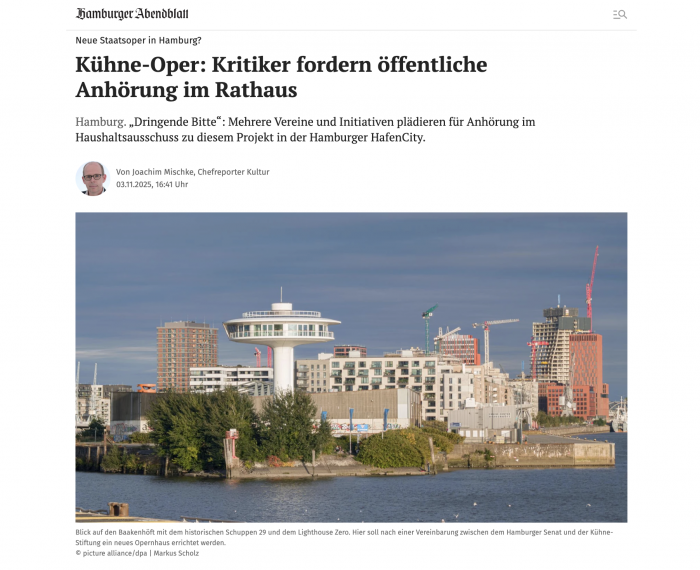 Hamburger Abendblatt 03.11.2025: »Kühne-Oper: Kritiker fordern öffentliche Anhörung im Rathaus«