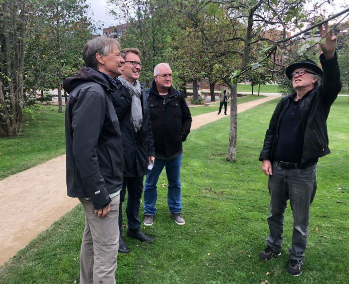 Die Freunde des Lohsepark hatten bei der HafenCity Hamburg GmbH auch diese Begehung des Parks  mit dem Pomologen Joachim Reinig angeregt, da einige Apfelbäume nicht in gutem Zustand sind. Zwei Bäume waren wegen eines - sehr ungewöhnlichen - Borkenkäferbefalls schon gefällt worden. Der Pomologe entdeckte einen weiteren Befall in der eingezäunten Wildnis, äußerte aber auch den Verdacht, dass es sich um Buchsbaum-Splintkäfer handeln könnte. Zudem leiden viele Apfelbäume unter verschiedenen Pilzen, Triebe sind aufgrund der Trockenheit abgestorben, oder die Bäume hatten erst gar nicht richtig ausgetrieben, manche Bäume blühen, was ein Hilferuf ist. Ein Apfelbaum hatte Krebs. Die Ursachenforschung ist noch nicht vollständig abgeschlossen.