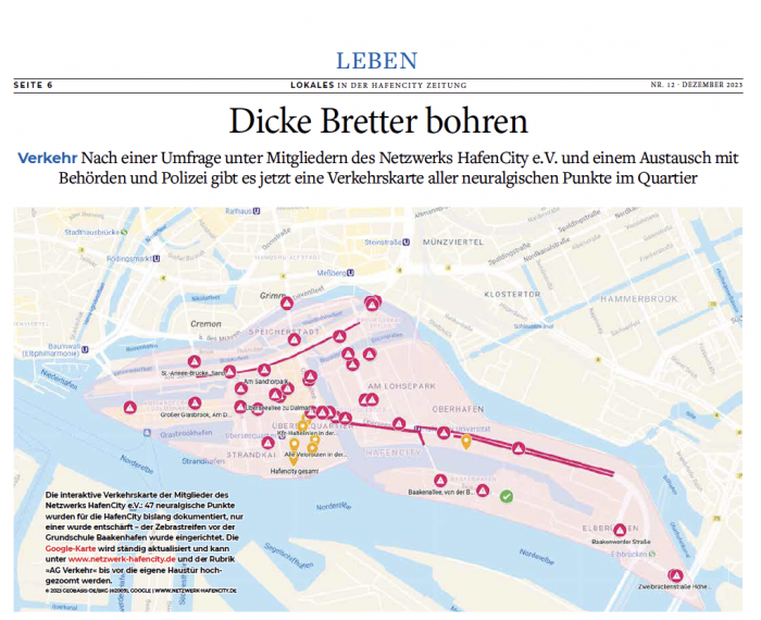 Verkehr: Nach einer Umfrage unter Mitgliedern des Netzwerks HafenCity e. V. und einem Austausch mit Behörden und Polizei gibt es jetzt eine Verkehrskarte aller neuralgischen Punkte im Quartier