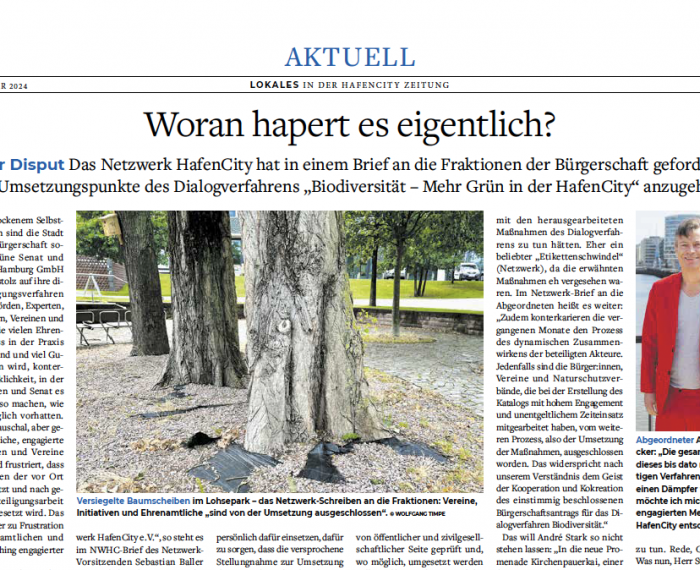 Grüner Disput: Das Netzwerk HafenCity hat in einem Brief an die Fraktionen der Bürgerschaft gefordert, die 38 Umsetzungspunkte des Dialogverfahrens „Biodiversität – Mehr Grün in der HafenCity“ anzugehen.
