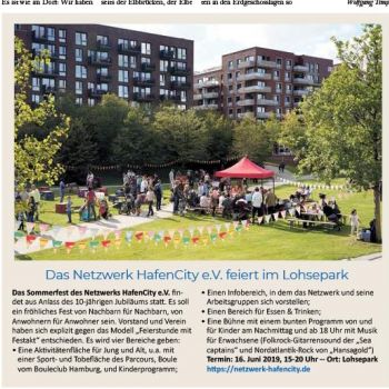 Am Sonnabend, 27. August, findet das Nachbarschaftsfest des Netzwerks HafenCity e.V. im Lohsepark statt. Gefeiert wird …