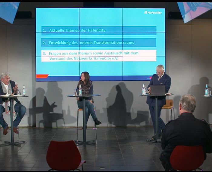 Ein Gespräch über die Planungen der HafenCity ohne Publikum im Raum – für die beiden Vorstände des Netzwerk HafenCity, Wolfgang Timpe und Marianne Wellershoff, war das eine neue Erfahrung. Sie saßen an weit auseinander stehenden Stehtischen bei der Bewohnerveranstaltung der HafenCity Hamburg GmbH am 26. November im Kesselhaus, die Zuschauer hingegen zuhause vor dem Monitor.